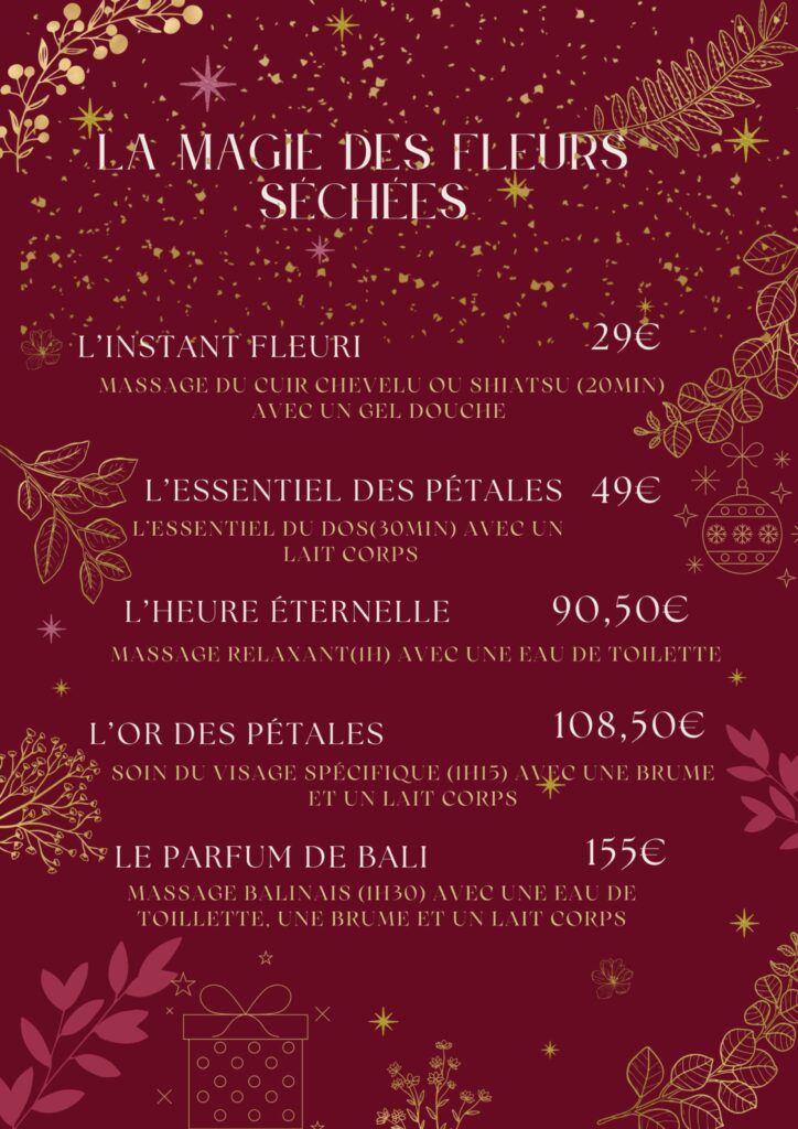 La magie des fleurs séchées ! La frénésie de Noël s’invite dans votre l’institut, vous trouverez ci-dessous nos prestations pour cette fin d’année.